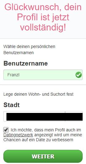 Wir empfehlen Ihnen dringend bei der Registrierung die Datingnetzwerk-Option zu aktivieren. Nur dann erhalten Sie deutlich mehr Frauen in Ihrer Region präsentiert.