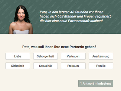 Die Partnerbörse richtet sich an die Zielgruppe der ü30er, die nach einer festen Partnerschaft suchen. Am Anfang fast jeder Partnerbörse steht der Test.
