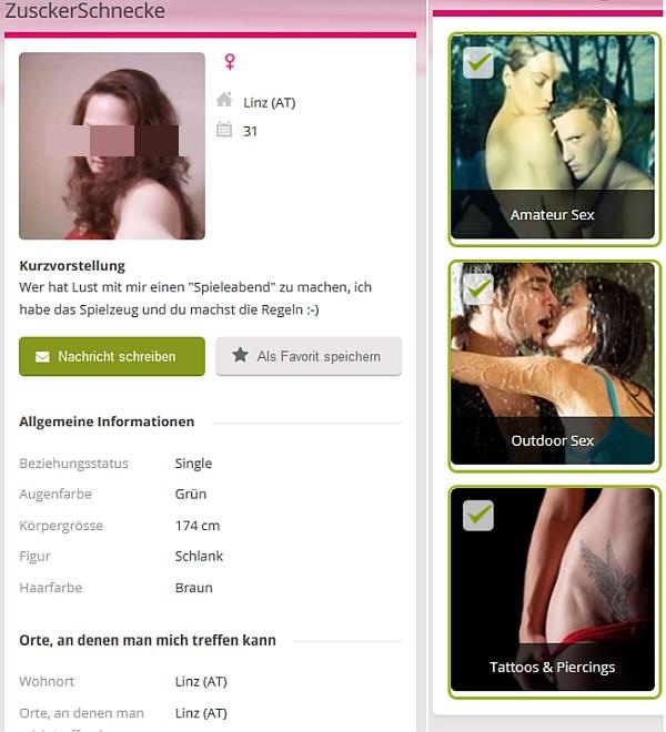 Viele Frauenprofile sind gut ausgefüllt. Das erleichtert Männern das Verfassen einer ersten Nachricht. Bei den meisten Damen finden Sie Informationen, die der perfekte Eisbrecher sind. Ob Vorlieben, Neigungen oder Fantasien – jede Frau freut sich, wenn Sie im 1. Anschreiben auf sie eingehen.