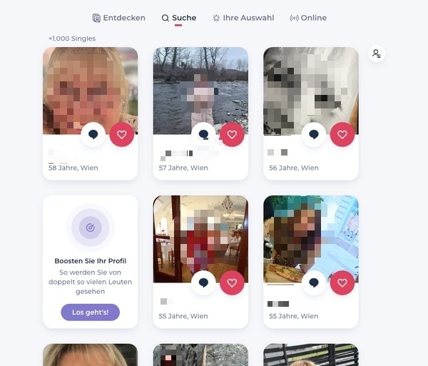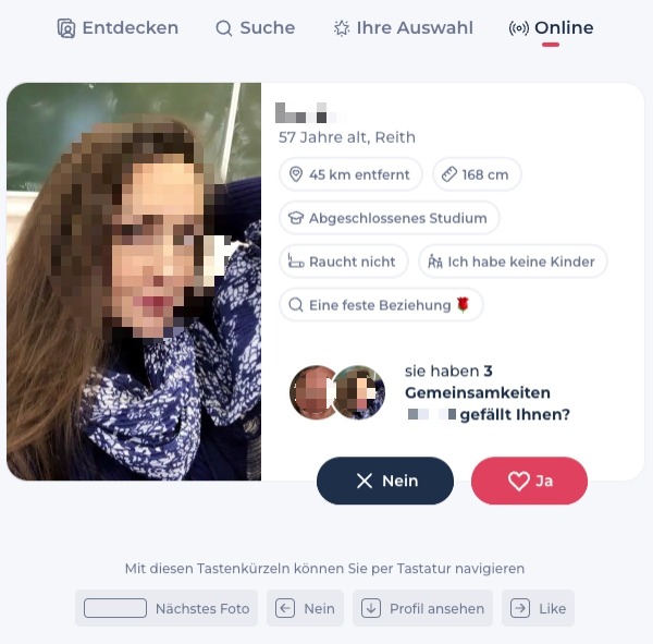 Unter der Rubrik “Entdecken” erhalten Sie jede Menge Datevorschläge nach dem bekannten Date-Roulette-Prinzip oder dem noch bekannteren Swipen bei Tinder. Wenn Sie auf den Reiter “Online” klicken, erwartet Sie dasselbe Spiel, nur mit Singles, die gerade auch online sind und mit denen man sofort in einen Chat übergehen kann.