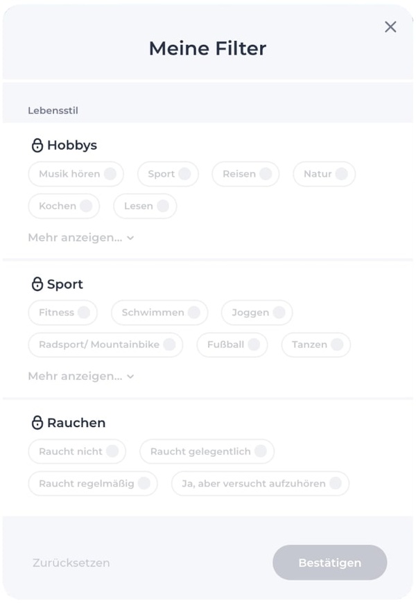 Um passende Suchergebnisse zu erhalten, stehen Ihnen jede Menge Kriterien unter dem Punkt „Suche“ zur Auswahl. So können Sie Ihre Partnersuche individuell auf Ihre Bedürfnisse zuschneiden. Einige Suchfunktionen können Sie jedoch nur als Premium-Mitglied auswählen.