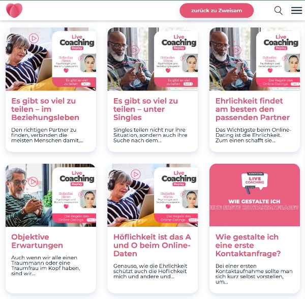 In den Video-Coachings für Singles auf Zweisam.at erhalten Sie Tipps von Experten und Expertinnen zu verschiedenen Themen. Sie besuchen mit anderen Teilnehmern einen interaktiven Livestream, wo Sie in einer ein- bis anderthalbstündigen Sitzung viele nützliche Tipps zu den Themen Dating, Liebe und Partnerschaft bekommen können.
