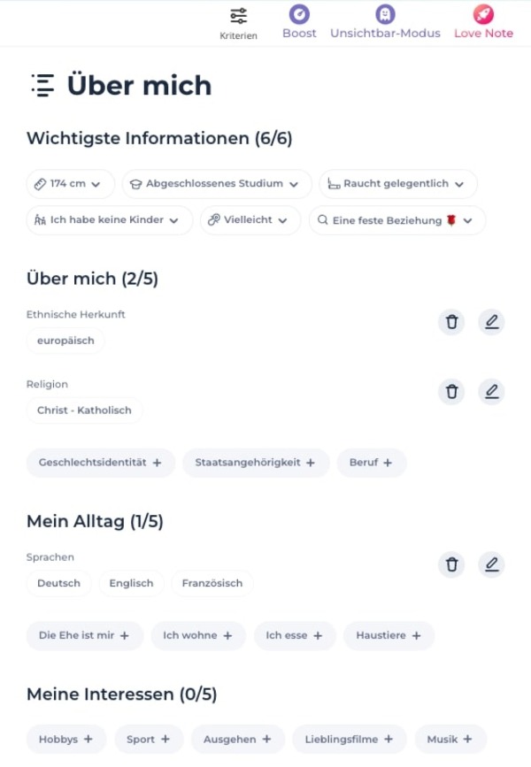 In der „Über mich“-Rubrik gibt es zig verschiedene Auswahloptionen, die jede Menge Ideen für eine Kontaktaufnahme bieten.